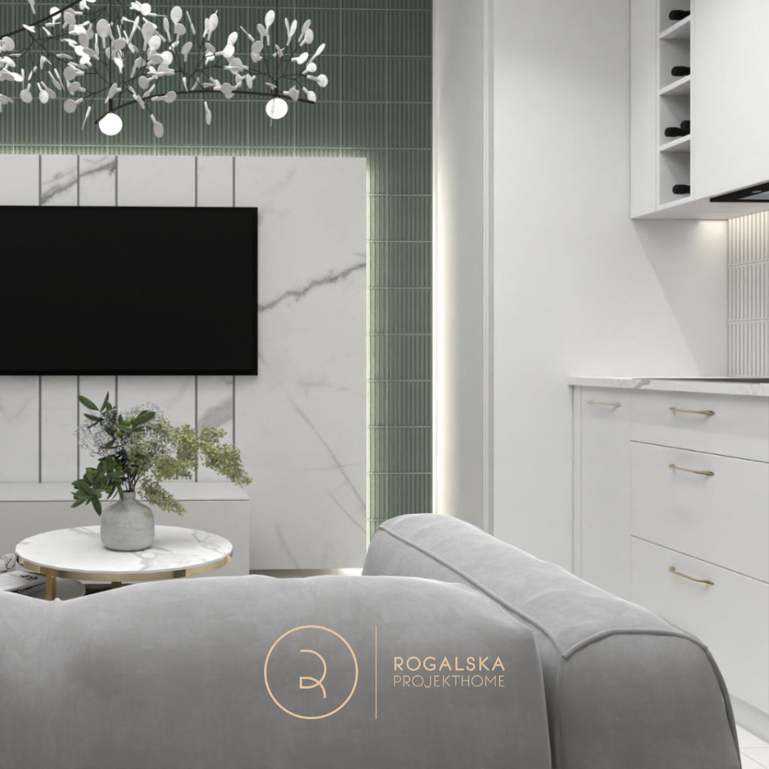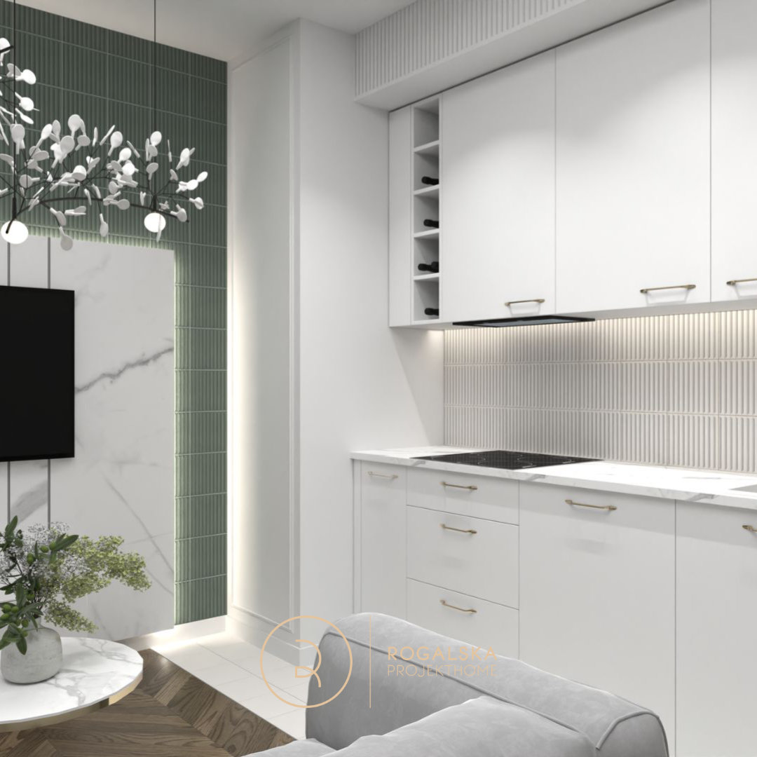 Mikroapartamenty wymagają szczególnego podejścia, by pomimo ograniczonej przestrzeni zmieścić wszystkie niezbędne elementy i zachować funkcjonalność. W tym przypadku udało się połączyć nowoczesny design z praktycznymi rozwiązaniami. Niewielka kuchnia doskonale łączy estetykę z użytecznością, a ryflowane maskownice ukrywają mniej atrakcyjne detale, doskonale współgrając z resztą wnętrza. Podłoga została wyłożona panelami we wzór jodełki, który wyróżnia się swoim charakternym wyglądem, dodając apartamentowi prawdziwie ziemistego uroku. Złote dodatki oraz subtelne sztukaterie kontrastują z minimalistycznym podejściem, wzbogacając przestrzeń o wytworne akcenty, a zasłony delikatnie rozpraszają naturalne światło, zapewniając przytulność.