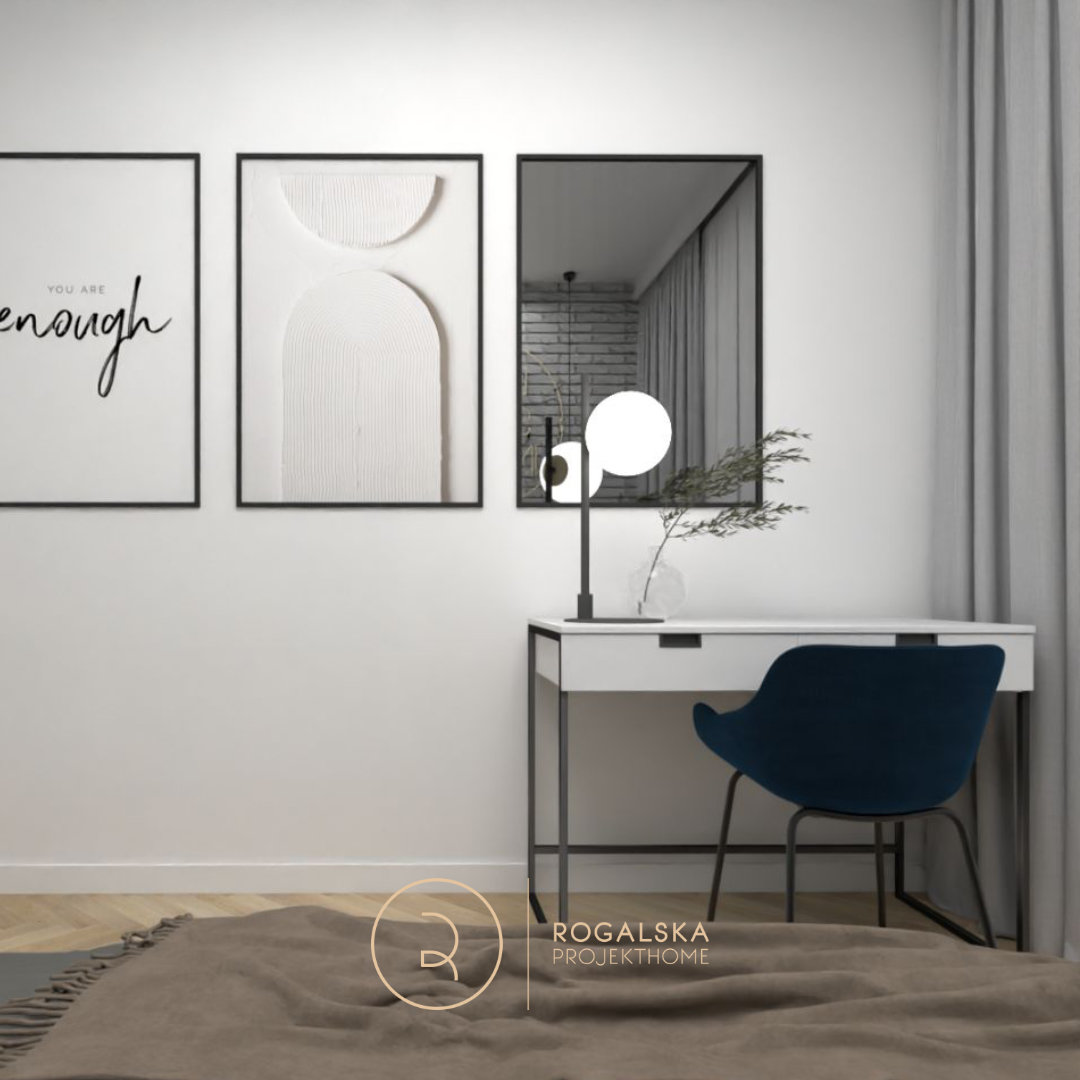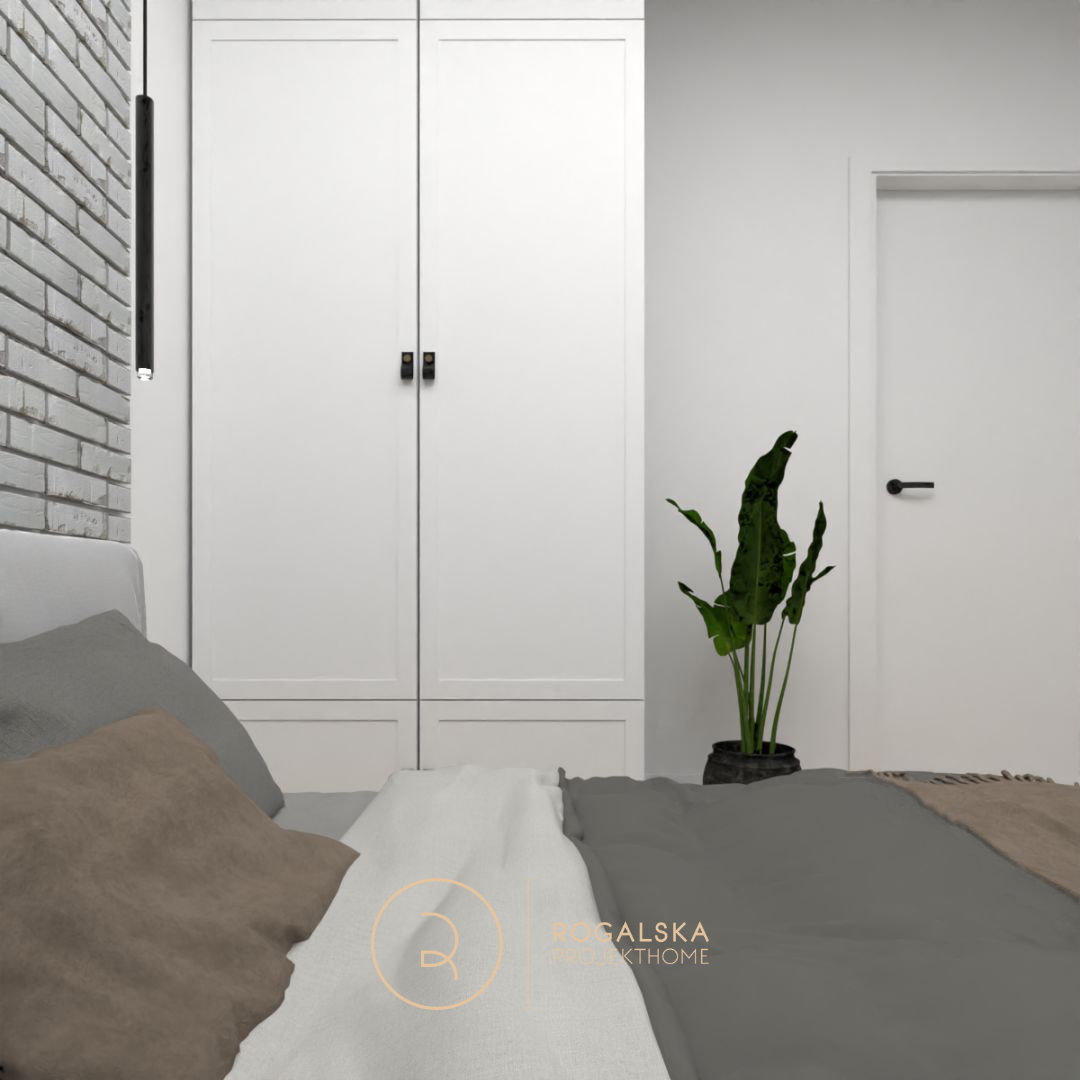 Ściana wykończona jasną, szarą cegłą nadaje wnętrzu loftowego charakteru, który podkreśla klimatyczny neon. W samym centrum znalazło się duże, wygodne łóżko „gnieciuch”, spełnienie marzeń po długim dniu. Funkcjonalna konsola może pełnić rolę biurka do pracy i nauki lub funkcję toaletki, dostosowując się do potrzeb użytkownika. Jest też szafa, która pomieści wszystkie niezbędne rzeczy, pozostawiając przestrzeń uporządkowaną i schludną. Wnętrze jasne, w neutralnych barwach, zaprojektowane tak by najemca mógł się w nim czuć po prostu dobrze.