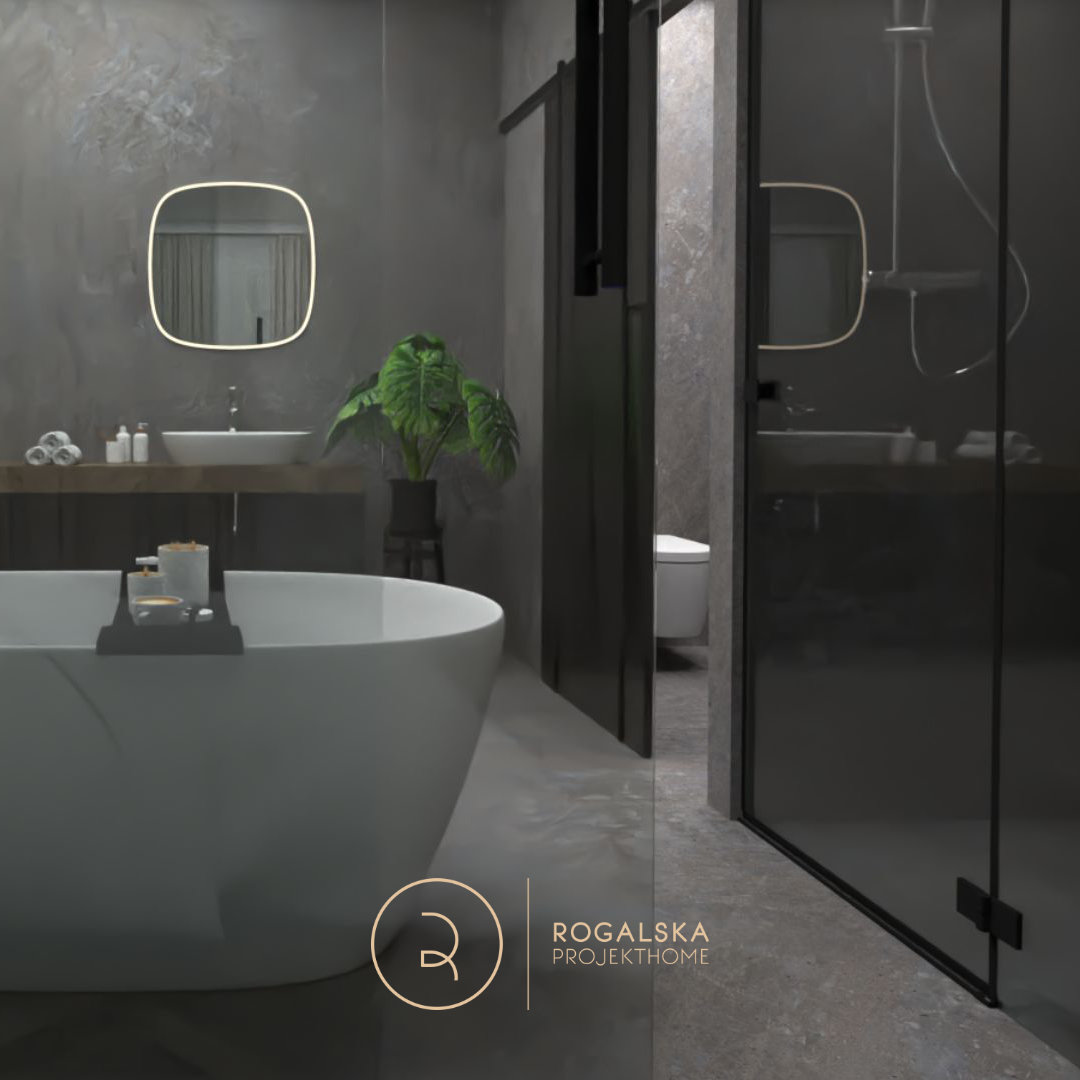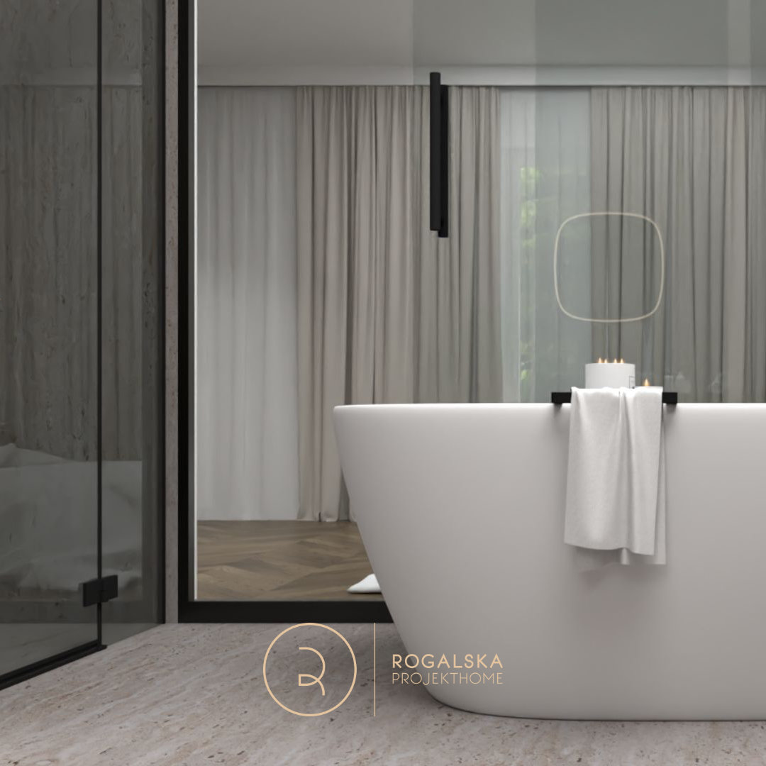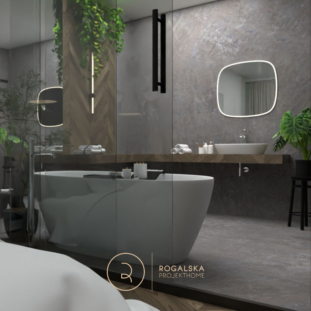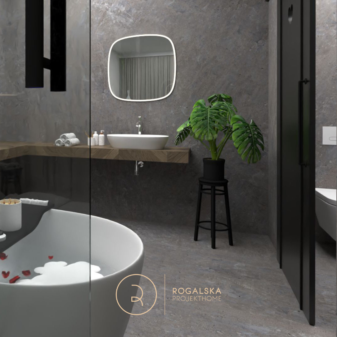 Zaprojektowane wnętrze łączy surowość kamienia z ciepłem drewnianej jodełki. Łazienka utrzymana jest w szarej tonacji, wzbogaconej czarnymi dodatkami. Dobór użytych materiałów tworzy wyrazistą kompozycję, ale i emanuje spokojem. Wyjątkową cechą tego miejsca z pewnością jest przemyślany układ przestrzenny, który pozwala cieszyć się widokiem zarówno z łazienki na sypialnię, jak i odwrotnie. Nie bez powodu wanna umieszczona została w centralnym punkcie, gdzie ma zapraszać do romantycznej kąpieli z wyjątkową scenerią. Toaleta jest schowana za pełnymi, przesuwnymi drzwiami z wyciętym sercem, co wprowadza oryginalny akcent, a jednocześnie zapewnia odpowiednią intymność. Rośliny rozmieszczone w przestrzeni mają za zadanie ożywiać wnętrze i to robią. Ostatecznie, całość balansuje między surowością, a przytulnością, tworząc idealne miejsce do wypoczynku i chwili wytchnienia w codziennym biegu.