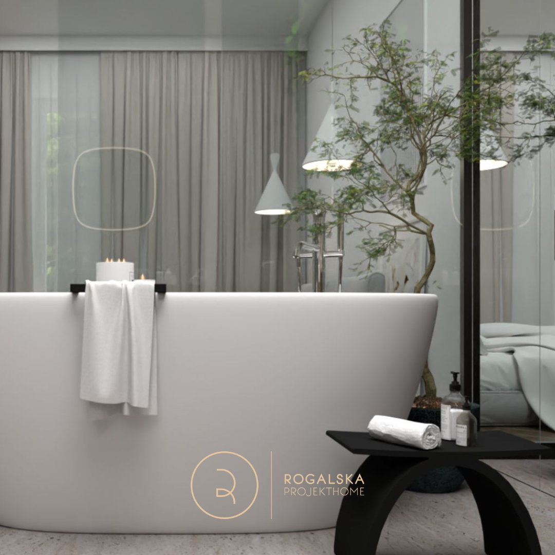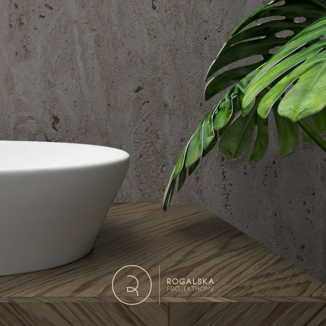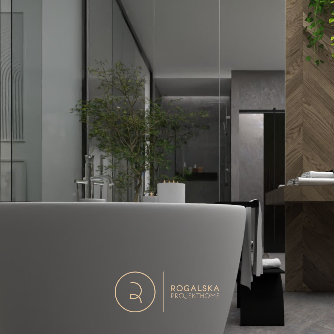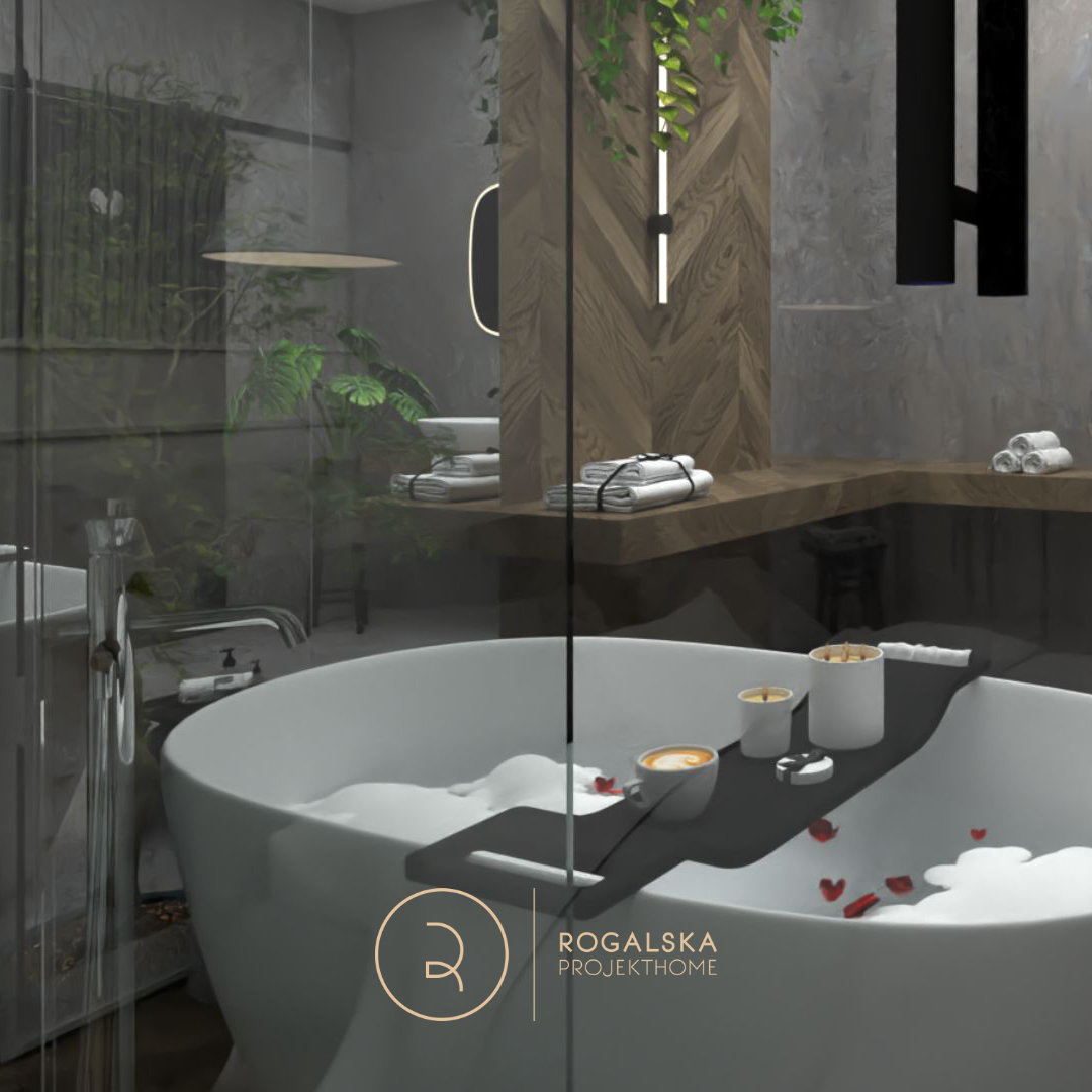 Zaprojektowane wnętrze łączy surowość kamienia z ciepłem drewnianej jodełki. Łazienka utrzymana jest w szarej tonacji, wzbogaconej czarnymi dodatkami. Dobór użytych materiałów tworzy wyrazistą kompozycję, ale i emanuje spokojem. Wyjątkową cechą tego miejsca z pewnością jest przemyślany układ przestrzenny, który pozwala cieszyć się widokiem zarówno z łazienki na sypialnię, jak i odwrotnie. Nie bez powodu wanna umieszczona została w centralnym punkcie, gdzie ma zapraszać do romantycznej kąpieli z wyjątkową scenerią. Toaleta jest schowana za pełnymi, przesuwnymi drzwiami z wyciętym sercem, co wprowadza oryginalny akcent, a jednocześnie zapewnia odpowiednią intymność. Rośliny rozmieszczone w przestrzeni mają za zadanie ożywiać wnętrze i to robią. Ostatecznie, całość balansuje między surowością, a przytulnością, tworząc idealne miejsce do wypoczynku i chwili wytchnienia w codziennym biegu.